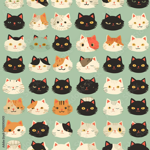 Seamless pattern of vintage style cats on green background, featuring various expressions