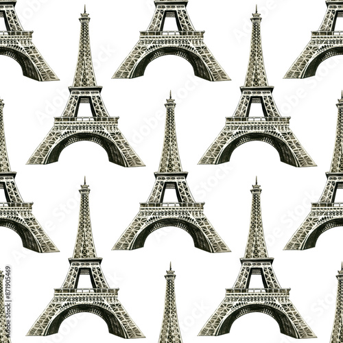 Seamless pattern of Watercolor hand drawn Eiffel Tower on white background. Paris France. Print on t-shirts and bags, for cards, banner or poster, card, design, artistic. Lifestyle, Travel Tour Eiffel