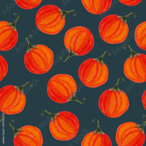 seamless pattern of watercolor pumpkins on dark background, hand painted illustration elements
