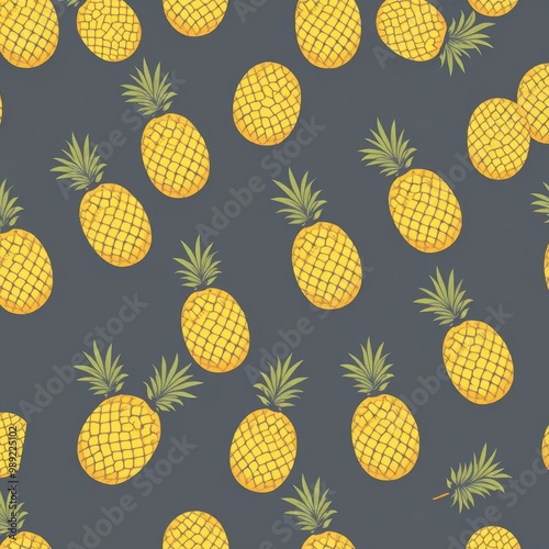 Seamless Pattern of Yellow Pineapples on Dark Blue Background