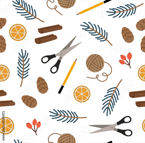Seamless pattern of zero-waste, eco-friendly packaging gifts. Nature decor, and tools for decoration. Spruce twig, cinnamon stick, orange slice, cone, threads, scissors, pencil, berries.