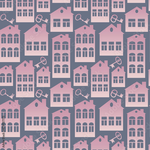Seamless pattern on a square background on the theme of real estate (rent or sale) - houses and keys. Design element of books, notebooks, postcards, interior items. Wallpapers, textiles, packaging