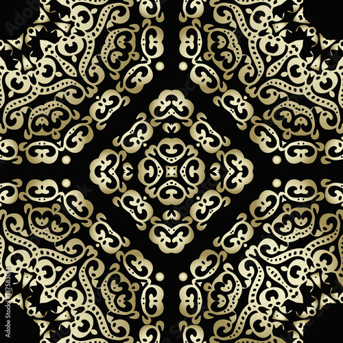Seamless pattern oriental ornament. Black and golden textile print. Islamic vector design. Floral tiles.