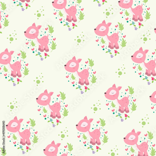 Seamless pattern. Portrait of cute pink mouse deer with love and flowers. pattern For valentine,bed sheets, cover bed, baby pajamas, print, packaging, decoration, wallpaper and design