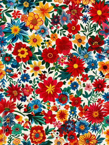 seamless pattern repeated vibrant floral flower bold red yellow bloom white background hand drawn decorative blue lively bouquet full retro vintage daisy sunflower rose peony wildflower grass leaves