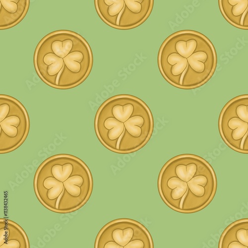 Seamless Pattern Small Golden Coins with Shamrock Stamp on Green Background