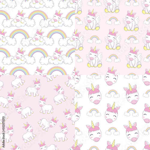 Seamless pattern unicorn fairy cartoon cute Pony Child jump in air with star and cloud: Series Fairytale Kawaii animals (Girly doodles). Perfect for Nursery kids,greeting card,baby shower girl,fabric.