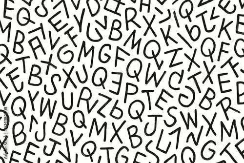 Seamless pattern unreadable letters collage. Jumbled hand-drawn alphabet characters in black on white background. Chaotic typography texture for abstract design, education, communication problem.