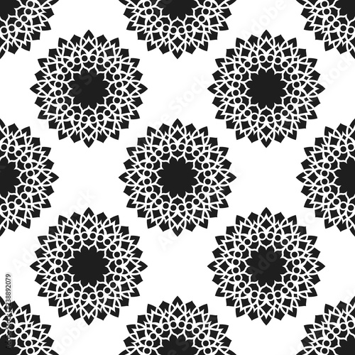 Seamless pattern with abstract flowers. Fashion textile print. Asian fabric background. Vector monochrome design. Perforation floral holes.
