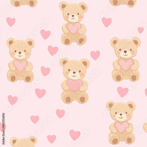Seamless Pattern with Beige Teddy Bear Holding Heart on Pink Background, Kids Design