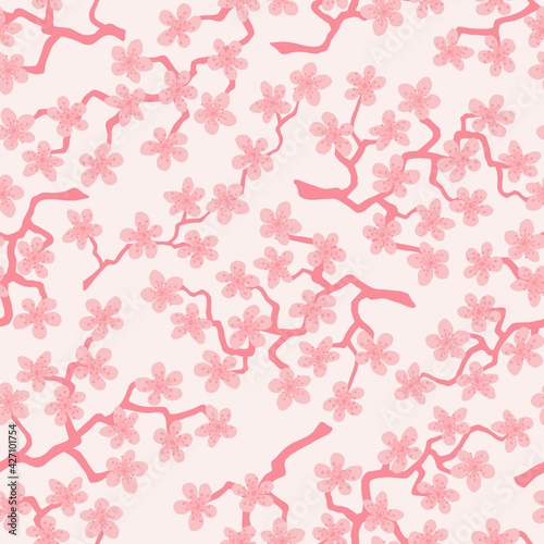Seamless pattern with blossoming Japanese cherry sakura branches for fabric,packaging,wallpaper,textile decor,design, invitations,cards,print,gift wrap,manufacturing.Pink flowers on pink background
