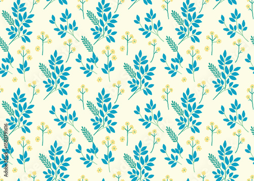 Seamless Pattern With Blue Leaves And Yellow Floral Accents On A Light Background, Ideal For Textiles Or Wallpaper.
