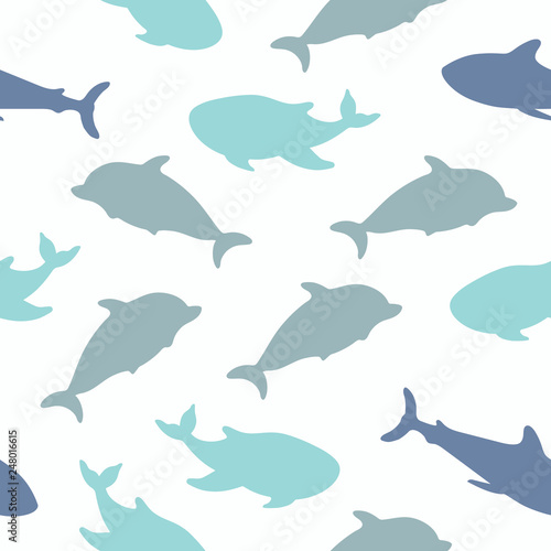 Seamless pattern with blue silhouettes of various sea animal icons: whale, dolphin, shark. Endless textures with marine, sea, aquatic creatures of ocean.