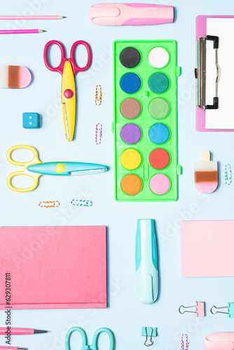 Seamless pattern with bright stationery supplies on light blue background top view. Back to school concept.