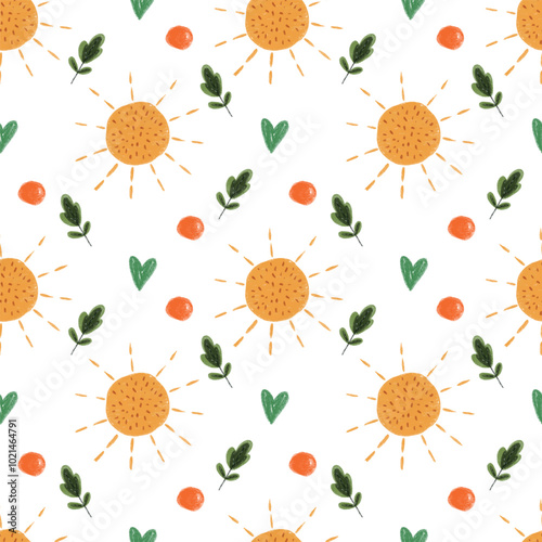 Seamless pattern with bright sun, green leaves, and colorful elements in a playful, hand-drawn charcoal doodle style