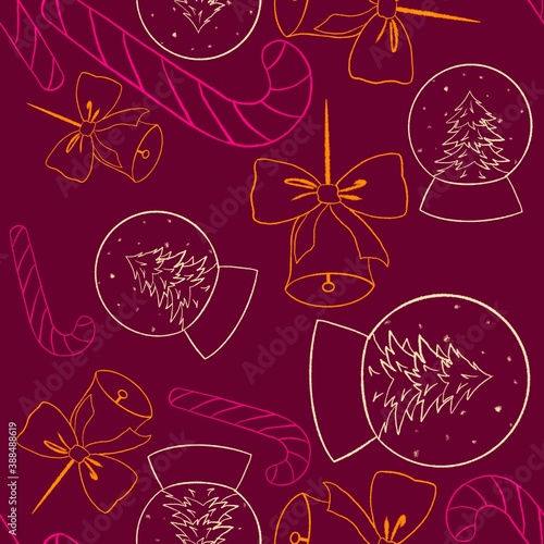 seamless pattern with christmas glass snow ball, candy cane and bell, outline style