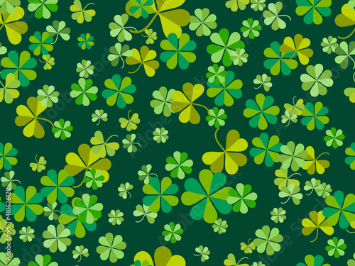 Seamless pattern with clover for Saint Patrick's Day. Green shades of four-leafed and three-leafed clover. Background for advertising products, postcards and printing. Vector illustration