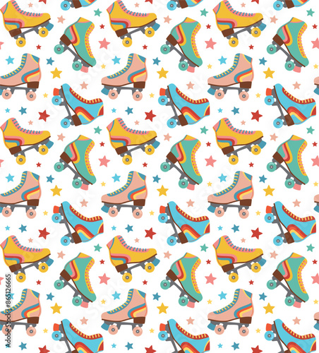 Seamless pattern with colorful retro roller skates and stars. Vector cartoon background in flat style.