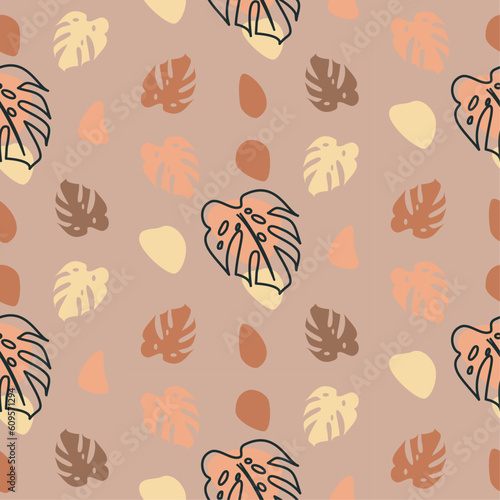 Seamless pattern with contour and colored monstera leaves on a light coffee background, freehand vector abstract illustration.