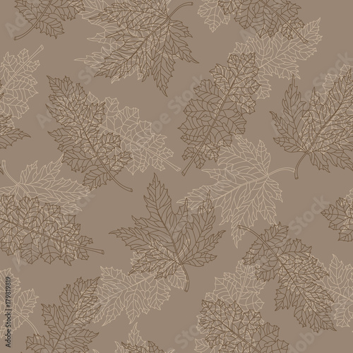 Seamless pattern with contour lacy brown leaves of different trees on a beige background