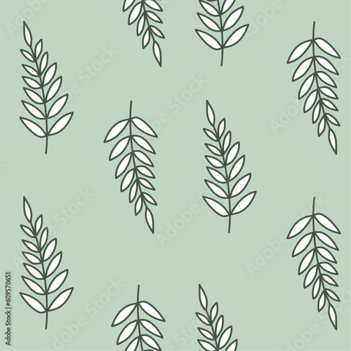 Seamless pattern with contour white branch with leaves on a light green background, freehand vector abstract illustration.