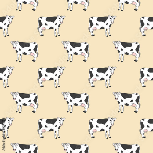 Seamless pattern with cow, farm (domestic) animal isolated on creame background. Cute print with colored graphic elements for textile, fabric, wrapping paper, scrapbooking, web design