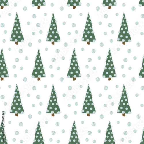 Seamless pattern with cute abstract christmas trees with balls Stylized hand drawn design Vector illustration in flat cartoon style for wrapping paper, textile, fabric and packaging decoration