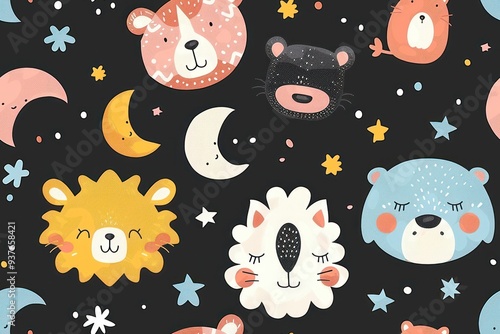 Seamless pattern with cute cartoon animals, stars and moons on black background.