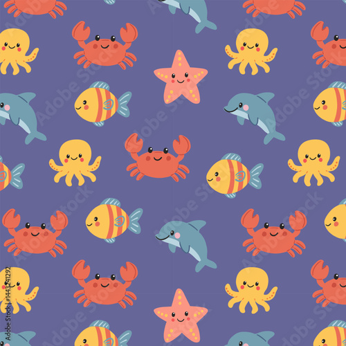 Seamless pattern with cute cartoon sea animals on purple background – crab, fish, starfish, octopus and dolphin. Flat marine vector for kids and ocean themes.