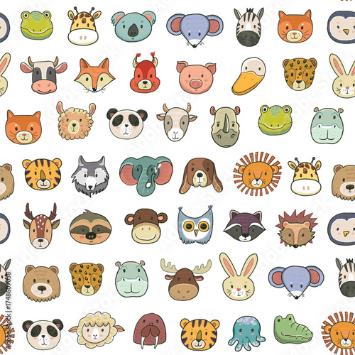 Seamless pattern with cute hand drawn animals heads. Vector illustration.