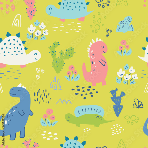 Seamless pattern with cute hand drawn dinosaurs for baby and kids fabric, textiles, wallpapers and products