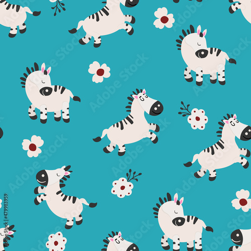 Seamless pattern with cute hand drawn zebras and flowers. Design for fabric, textile, wallpaper, packaging, decorating a nursery.