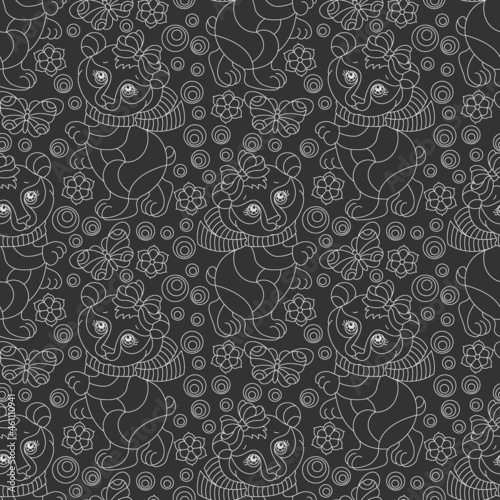 Seamless pattern with cute light outline bears, butterflies and flowers, contour animals on a dark background