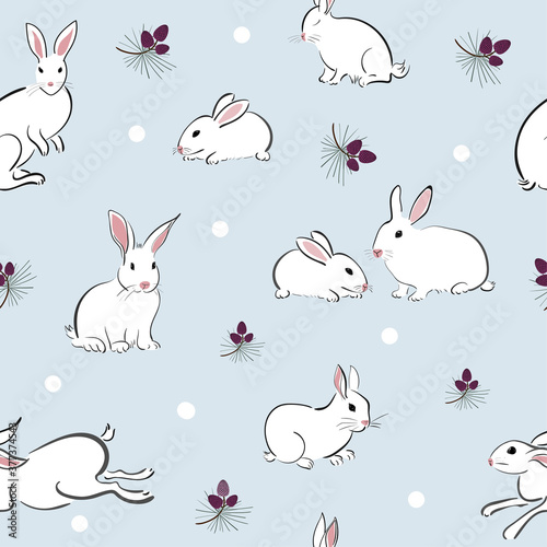 Seamless pattern with cute rabbit in oriental style with a pine cone on a blue background. Winter scene with hare and snow.