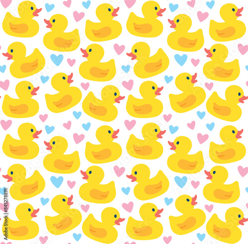 Seamless pattern with cute yellow ducks and hearts. Vector flat backdrop.