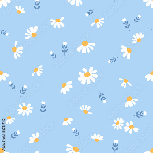 Seamless pattern with daisy flower and branches on blue background vector. Cute floral print.