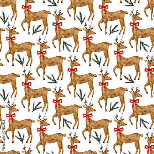 Seamless pattern with deer wearing red bows for christmas design, watercolor background.