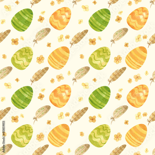 Seamless pattern with Easter eggs, butterflies and spring flowers in a green-orange palette. Rustic style. Watercolor clipart for eco farm products.