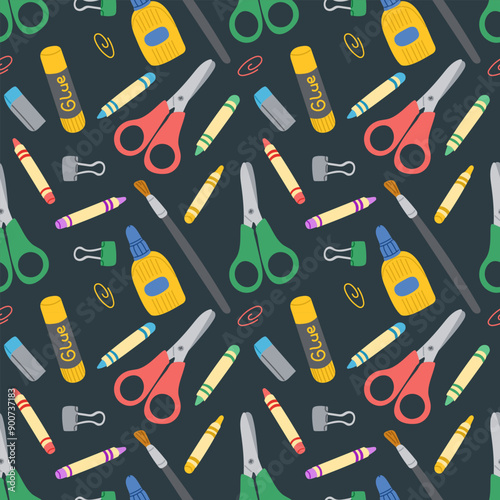Seamless pattern with flat scissors, crayons, clue, eraser, paint brush and paper clip. Traditional artistic or kids craft supplies, creative hobby accessories. Vector illustration on dark background