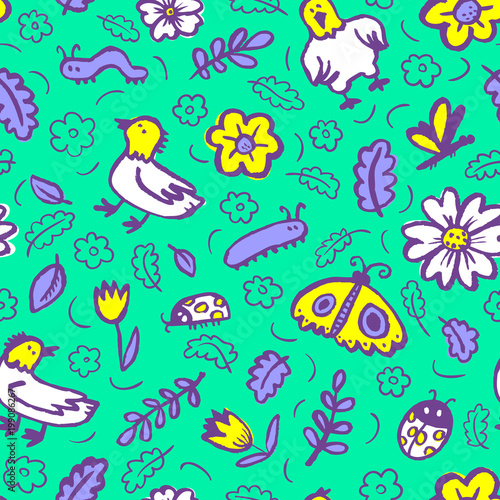 Seamless pattern with flowers and insects. Floral background with sketchy butterfly, dragonfly, tulips