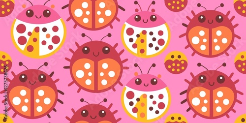 Seamless pattern with flowers and ladybugs. Bright colors. Ideal for gift wrapping or children's crafts.