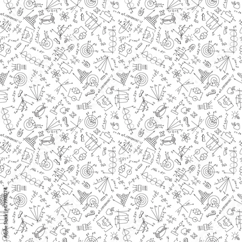Seamless pattern with formulas,graphs, and equipment as the subject of physics,dark marker on white background