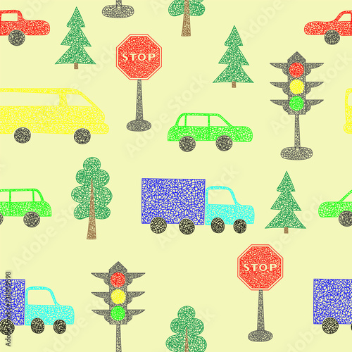Seamless pattern with hand drawn cars on yellow background in childrens naive style.