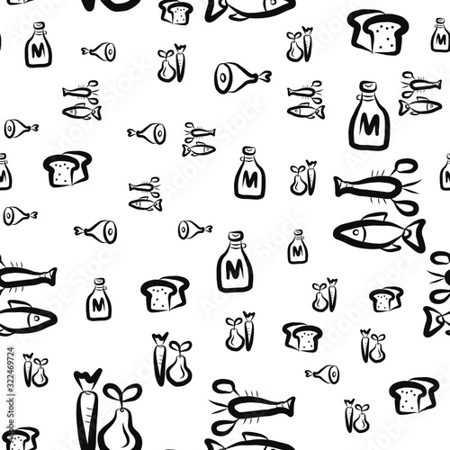 Seamless pattern with hand drawn food elements.fish, bread, seafood, milk, cheese, vegetables, greens.design for mugs, packaging paper, bed linen, t-shirts, banners, bags.vector illustration.monohrom
