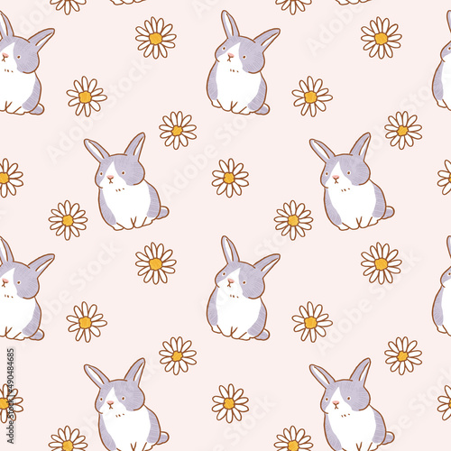 Seamless Pattern with Hand Drawn Rabbit and Flower Design on Light Pink Background