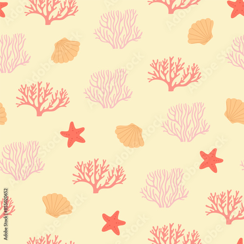 Seamless pattern with hand drawn seashell and corals on beige background. Template for print, fabric, greeting card and invitation.