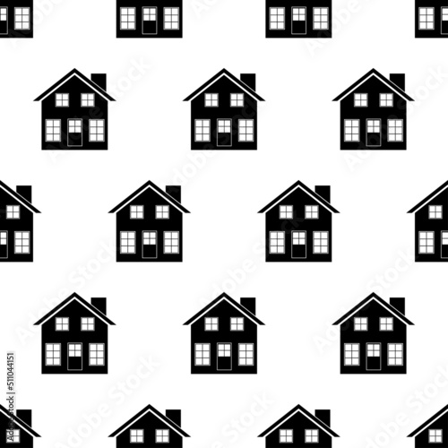 Seamless pattern with house. Black icon house in white background. House pattern. Silhouette building in flat design. Design for website, print on fabric, wallpaper, wrapping paper.Vector illustration
