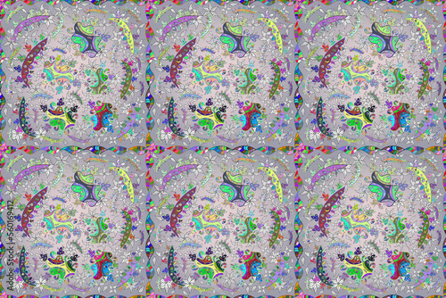 Seamless pattern with interesting doodles on colorfil background. illustration.