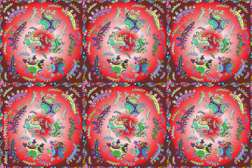 Seamless pattern with interesting doodles on colorfil background. Pano. Raster illustration.