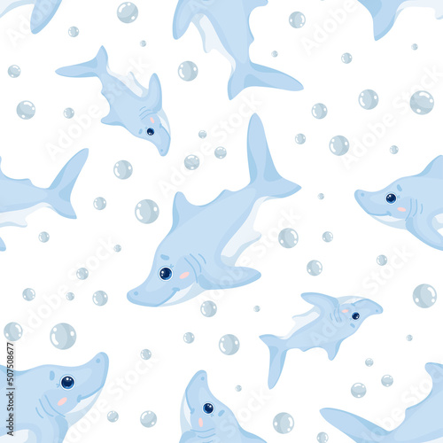 Seamless pattern with little cute sharks.Cartoon vector graphics.